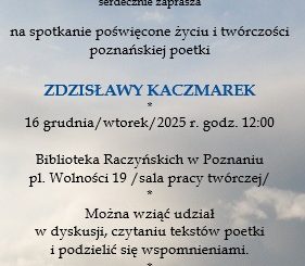 W czwartek 21 sierpnia 2025 o godzinie 17.00 w Bibliotece Raczyńskich w Poznaniu, Plac Wolności 19 odbędzie się spotkanie z poetką Anną Landzwójczak, zatytułowane: „Czy >>>